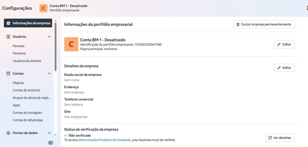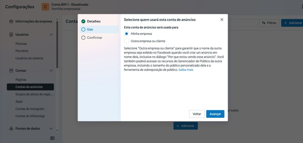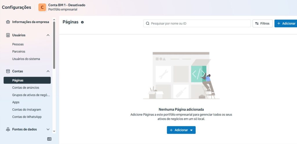 Dentro do meta Business Suite, NÃO precisa configurar as demais opções, como: : Grupos de ativos de negócios e APPS dentro da aba CONTAS.