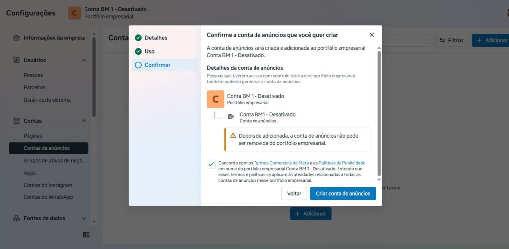 Ainda em “Contas“, vá na aba, “CONTAS DE ANÚNCIOS Escolha a opção: criar uma conta de anúncios.