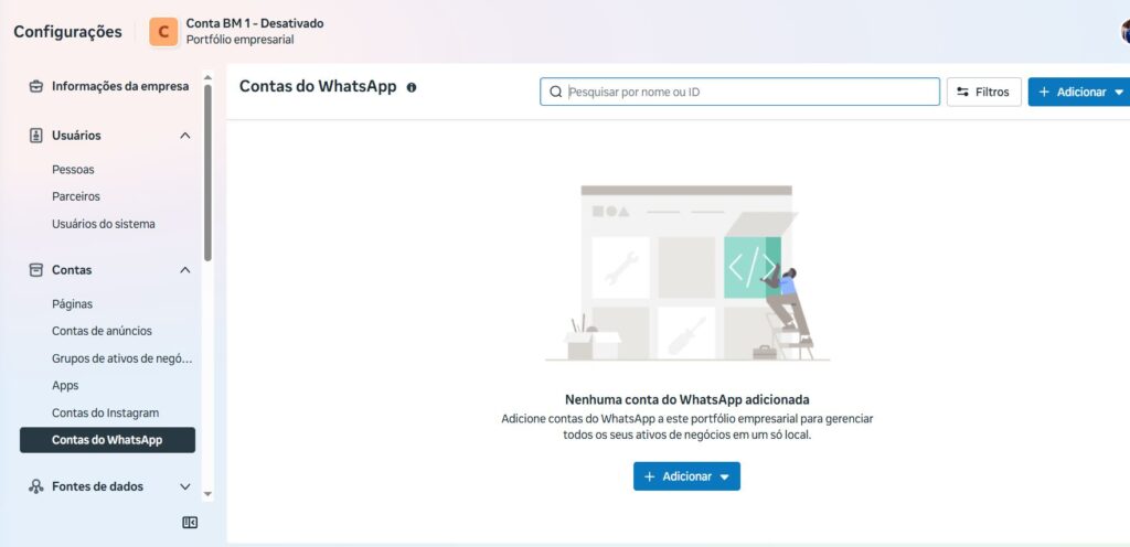 Ainda na aba “contas”, clique em: Contas do whatsapp, é obrigatório ser whatsapp bussines, e configure seu número comercial.
