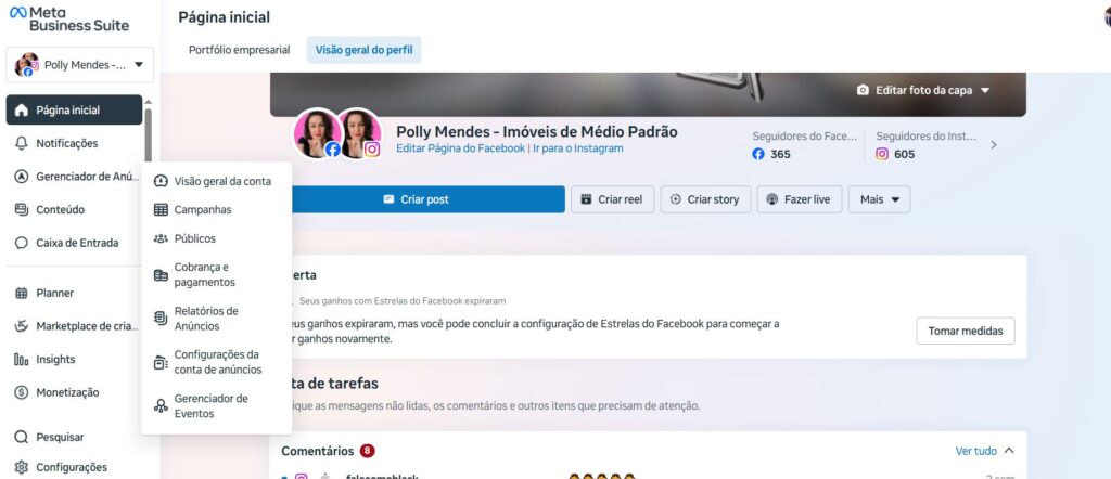 Volte na página principal do Meta Business Suite e no canto do menu lateral a esquerda