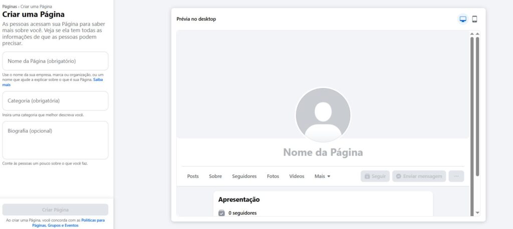 Caso não tenha, crie uma nova página nesse link: https://www.facebook.com/pages/creation