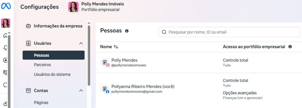 Ainda em “contas”, vá na aba, “Contas do Instagram” – Confira se a conta do instagram, está vinculada. Clique em atribuir pessoas no lado direito.