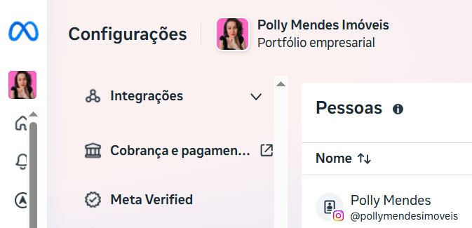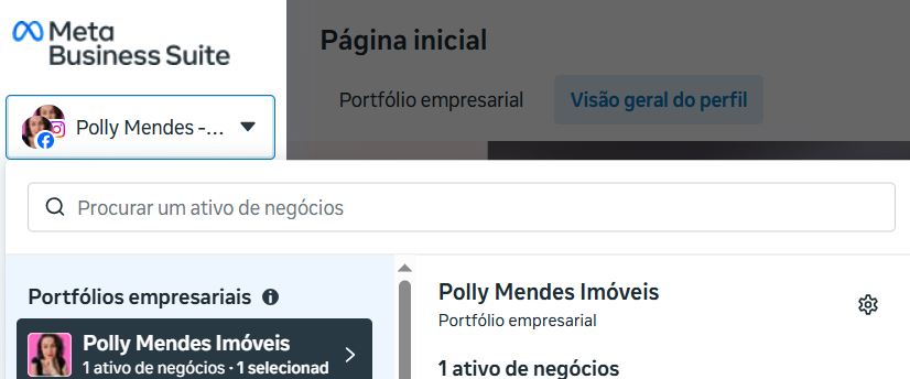 Confira se a página a ser configurada está seleciona do lado esquerdo, abaixo do nome Meta Business Suite