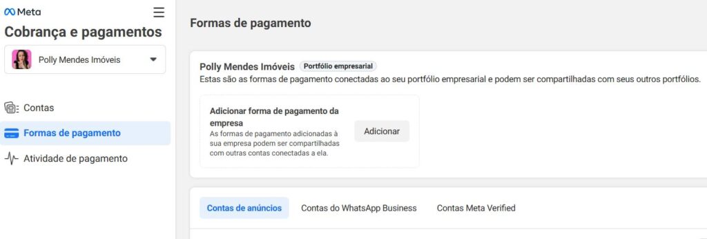 Clique em “FORMAS DE PAGAMENTO” escolha de preferência cartão de crédito, evite ficar trocando a forma de pagamento ou até mesmo o número do cartão para não tomar bloqueios. Não é aconselhável boleto ou pix, pois funcionam como forma de recarga e se por algum motivo você tomar bloqueio na conta de anúncios, os créditos serão perdidos.