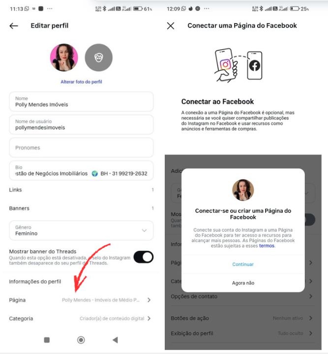 Para vincular: Faça login no seu instagram, “CLIQUE NA SUA FOTO NA PARTE INFERIOR DO CELULAR”, clique em EDITAR PERFIL, logo abaixo de informações do perfil, clique em PÁGINA, e siga os passos para vincular