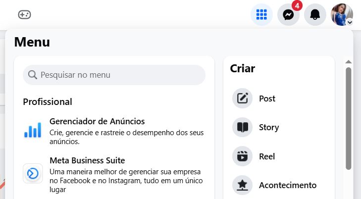 Primeiro: Faça login no seu perfil do Facebook e selecione acima da tela, no lado direito, a imagem com “vários quadradinhos azul”, Clique em “Meta Business Suite